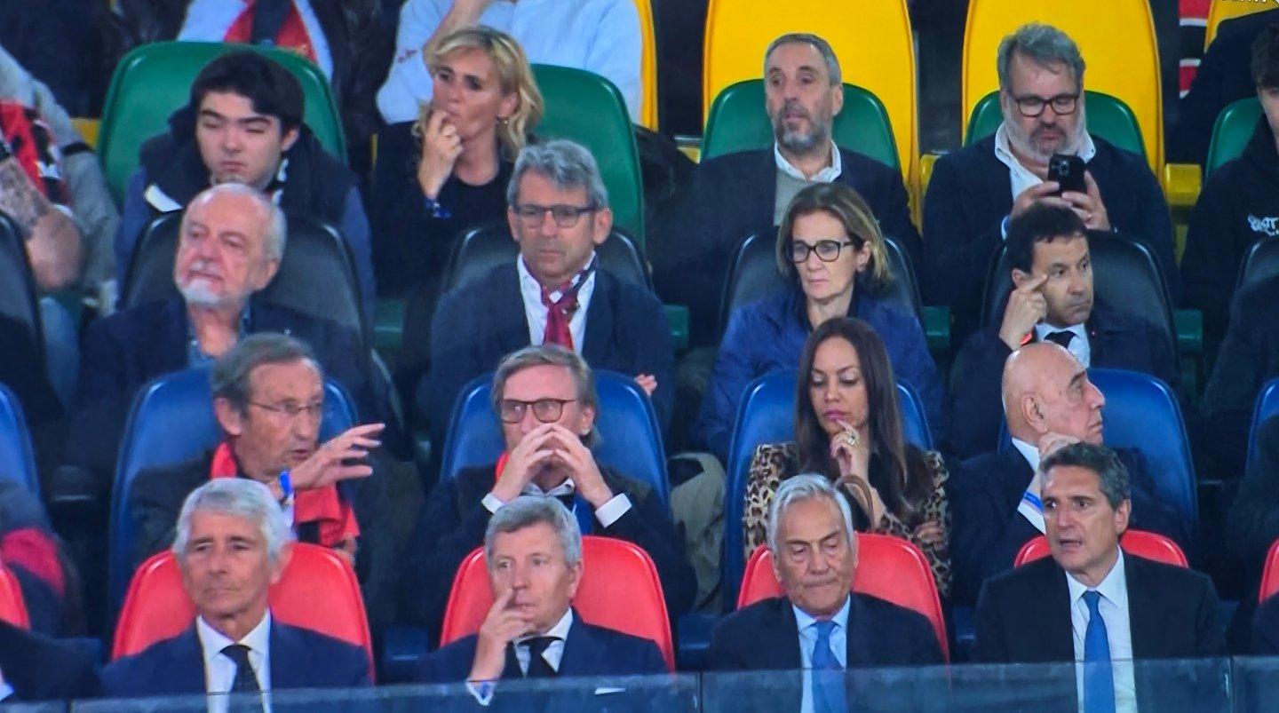 Il presidente del Napoli Aurelio De Laurentiis è a Roma e in queste ore. Dopo aver partecipato ad un'assemblea di Lega di Serie A, il patron azzurro è ora presente allo stadio Olimpico, dove in tribuna d'onore sta assitendo alla finale di Coppa Italia tra Milan e Bologna. In tribuna sono presenti anche il ct della Nazionale Luciano Spalletti, ex allenatore del Napoli, e l'ed ds azzurro. ora alla Juventus, Cristiano Giuntoli. De Laurentiis durante il primo tempo della finale è stato pizzicato dalle telecamere Mediaset, di seguito un fermo immagine.