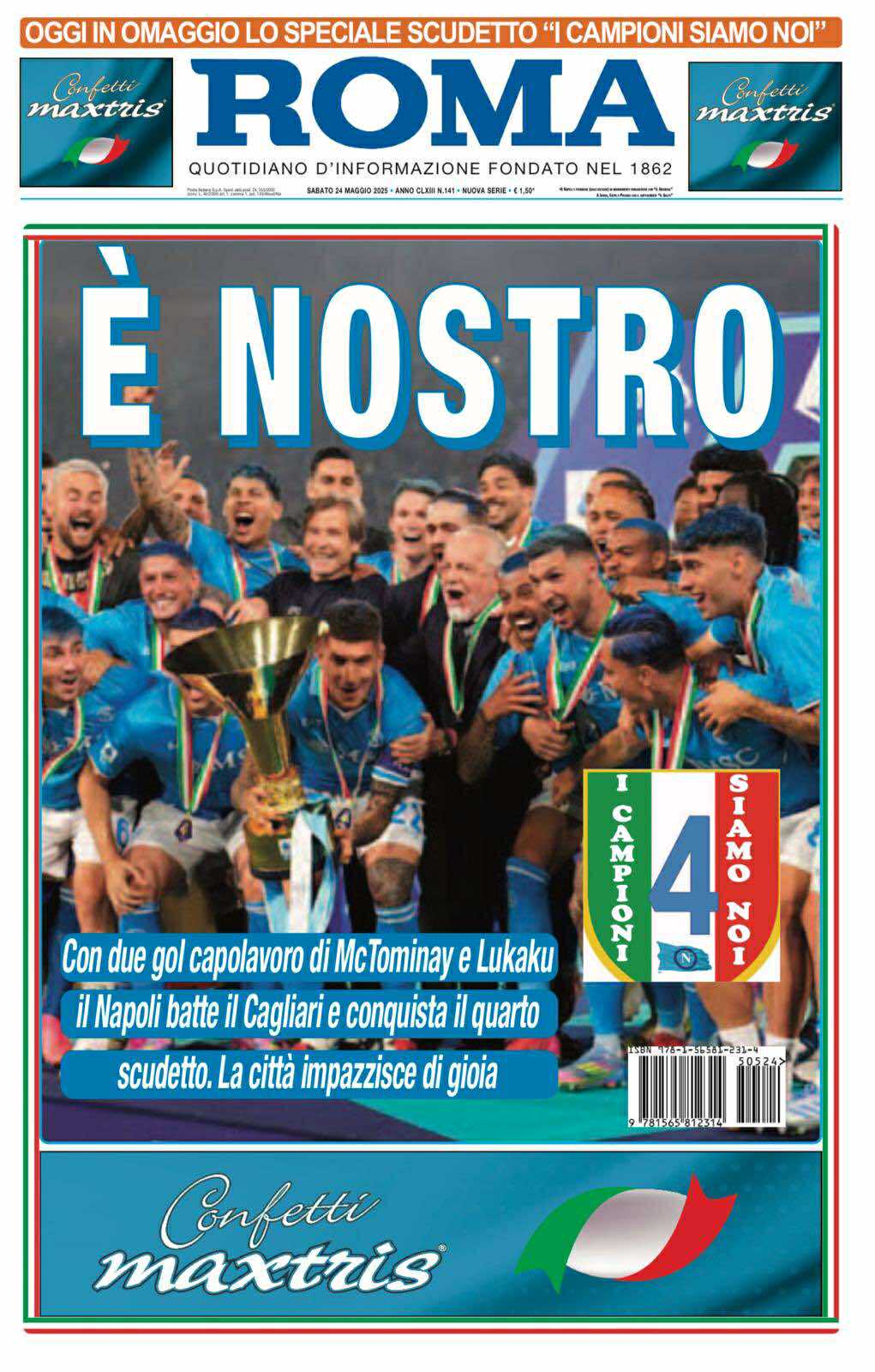 E' nostro, titola a tutta pagina il quotidiano partenopeo 'Il Roma' per celebrare lo storico trionfo del Napoli, il quarto, grazie al 2-0 sul Cagliari con le reti di McTominay e Lukaku che hanno significato il +1 sull'Inter vittoriosa a Como, ma inutilmente. Uno Scudetto che ha fatto impazzire di gioia la città. Di seguito la prima pagina integrale