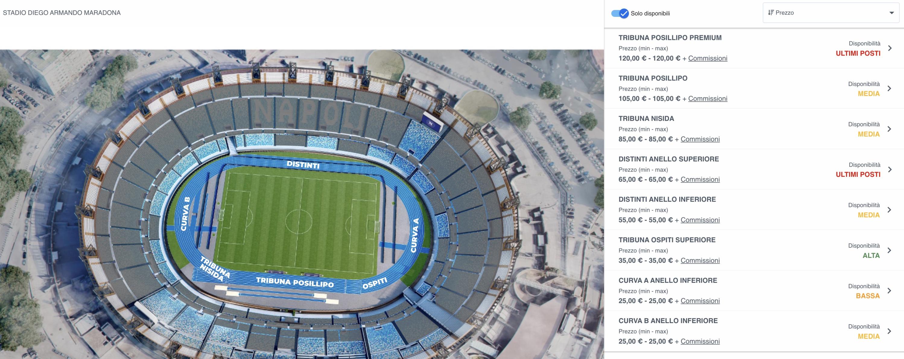 Prosegue la vendita dei biglietti per Napoli-Parma, recupero della 16ª giornata di Serie A, in programma mercoledì 14 gennaio alle 18:30 allo stadio Diego Armando Maradona. Al momento non si prospetta un pienone sugli spalti dell'arena di Fuorigrotta. Si registrano disponibilità di livello medio in Curva B inferiore, in Tribuna Posillipo e Tribuna Nisida, nei Distinti inferiori. Disponibilità bassa per la Curva A inferiore, mentre rimangono solo pochi posti nei Distinti superiori e in Tribuna Posillipo premium. Esaurite le Curve superiori e i Distinti premium.