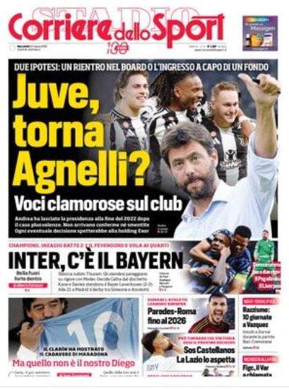 "Juve, torna Agnelli?". Si apre con questa domanda la prima pagina di oggi del Corriere dello Sport. Stanno prendendo corpo due ipotesi clamorose riguardo al club bianconero, con il rientro nel board dell'ex presidente o l'ingresso di quest'ultimo a capo di un fondo. Andrea Agnelli ha lasciato la presidenza della Juve alla fine del 2022, dopo il caso plusvalenze. Non arrivano conferme né smentite da Torino: ogni eventuale decisione spetterebbe alla holding Exor.