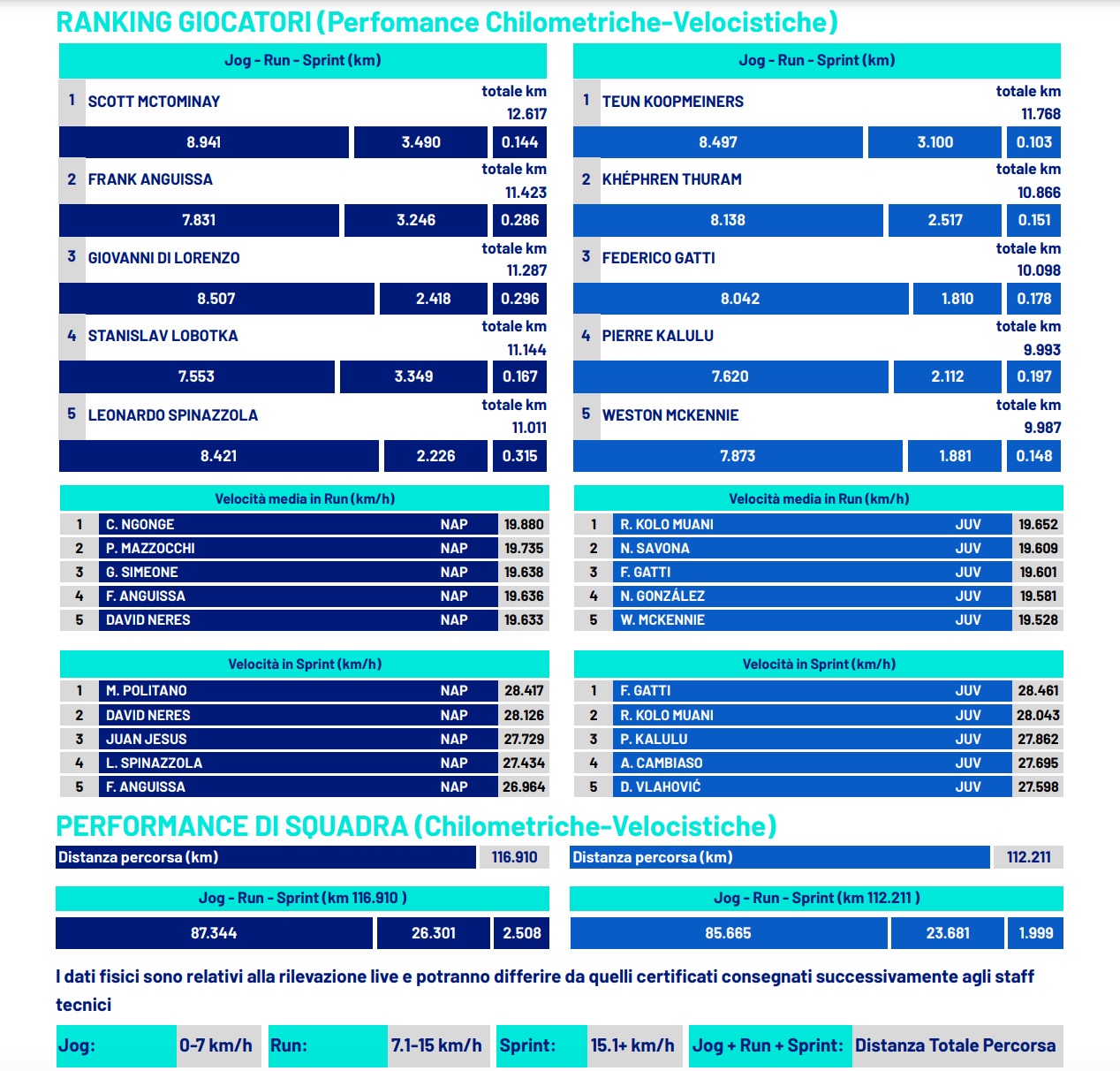 Alla fine della fiera domina sempre Scott McTominay: nessuno corre più di lui, in nessuna partita. E' accaduto anche nel match di ieri contro la Juventus: il centrocampista scozzese con 12,617 chilometri percorsi è il calciatore che ha coperto la maggiore distanza tra tutti quelli scesi in campo ieri sera al Maradona.