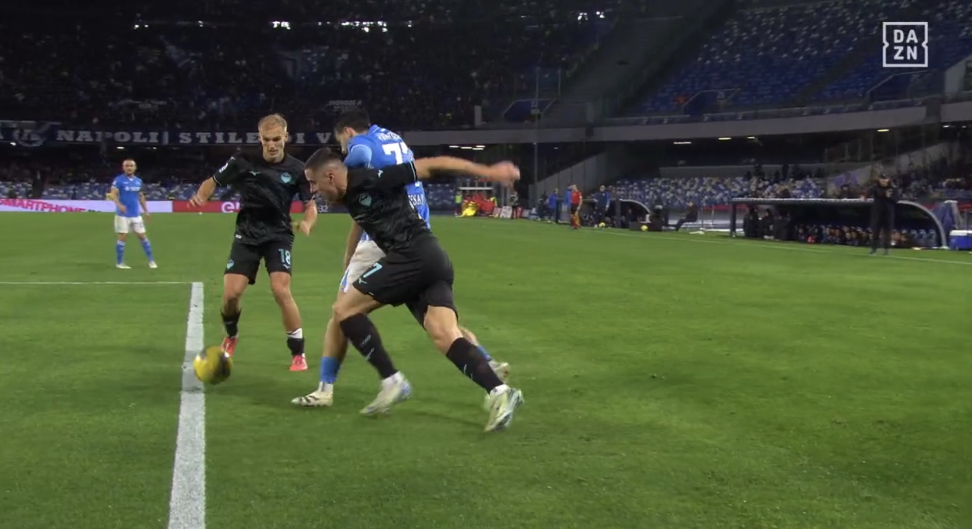 Minuto 41, Kvaratskhelia salta secco Marusic con un tunnel, poi il difensore biancoceleste nel tentativo di recuperare colpisce il georgiano da dietro, sulla gamba sinistra. Proteste del Napoli e del Maradona per un possibile calcio di rigore, così l'ex arbitro e analista Luca Marelli ha commentato l'episodio a Dazn: "Manca il fallo di Marusic su Kvaratskhelia. Ma il contatto con la gamba sinistra di Kvara era abbondantemente fuori area, circa mezzo metro".