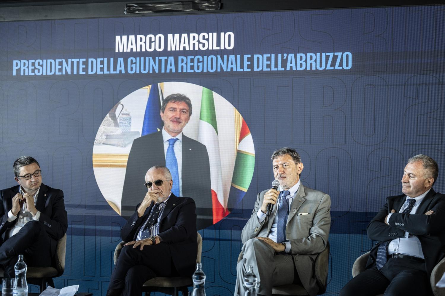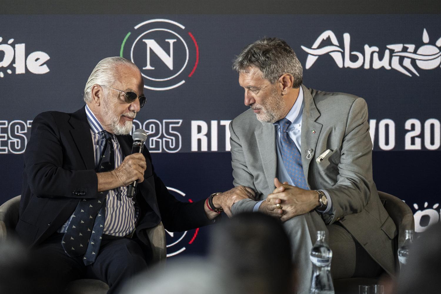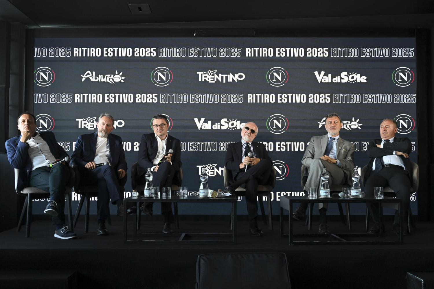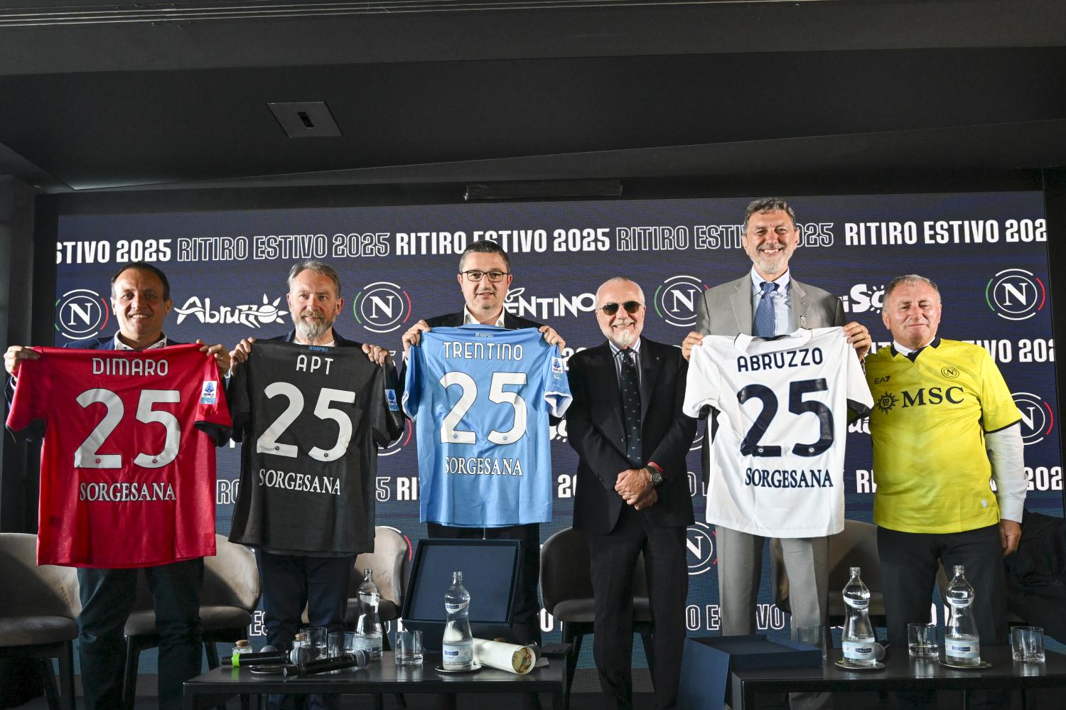Quest'oggi nella splendida cornice di Palazzo Petrucci, in via Posillipo, sono stati presentati i ritiri della SSC Napoli 2025/26 di Dimaro-Folgarida e Castel di Sangro. Alla presenza del presidente del Napoli Aurelio De Laurentiis, dei presidenti della Regione Abruzzo Marco Marsilio, della Provincia Autonoma di Trento Maurizio Fugatti e dell’Apt di Val di Sole Luciano Rizzi e dei sindaci di Dimaro Marco Panciera e Castel Di Sangro Angelo Caruso e si è tenuta la conferenza stampa di presentazione. Di seguito i migliori scatti dell'evento.