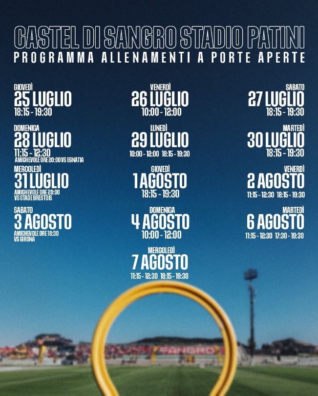 Dal 25 luglio al 7 agosto, di seguito tutti gli allenamenti che saranno aperti per i tifosi.