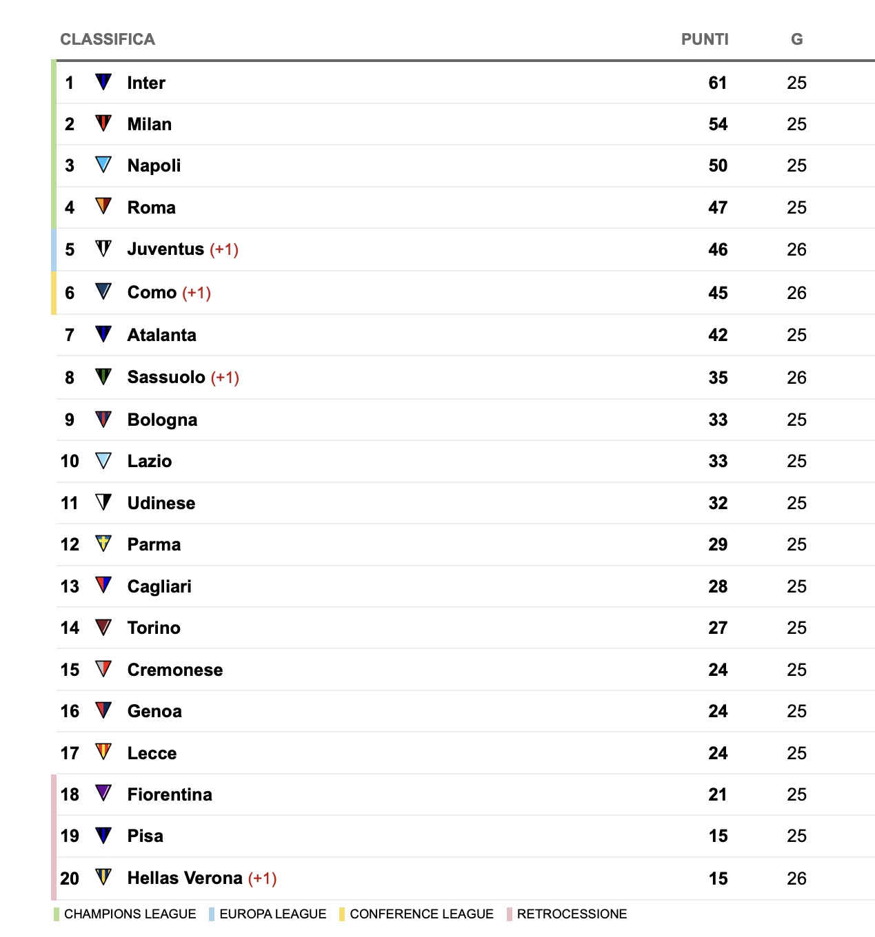La vittoria del Como contro la Juventus a Torino assume un peso enorme in chiave classifica e prospettive europee. Con questo successo, infatti, la squadra di Fabregas mette pressione ai bianconeri e alle altre contendenti per un posto in Champions League: attualmente, tra il Napoli terzo e il Como sesto, ci sono appena cinque punti di distacco. Per la squadra di Antonio Conte, che domani sarà impegnata a Bergamo contro l’Atalanta, una vittoria significherebbe consolidare il terzo posto e portarsi a +7 sul quinto occupato dalla Juventus.