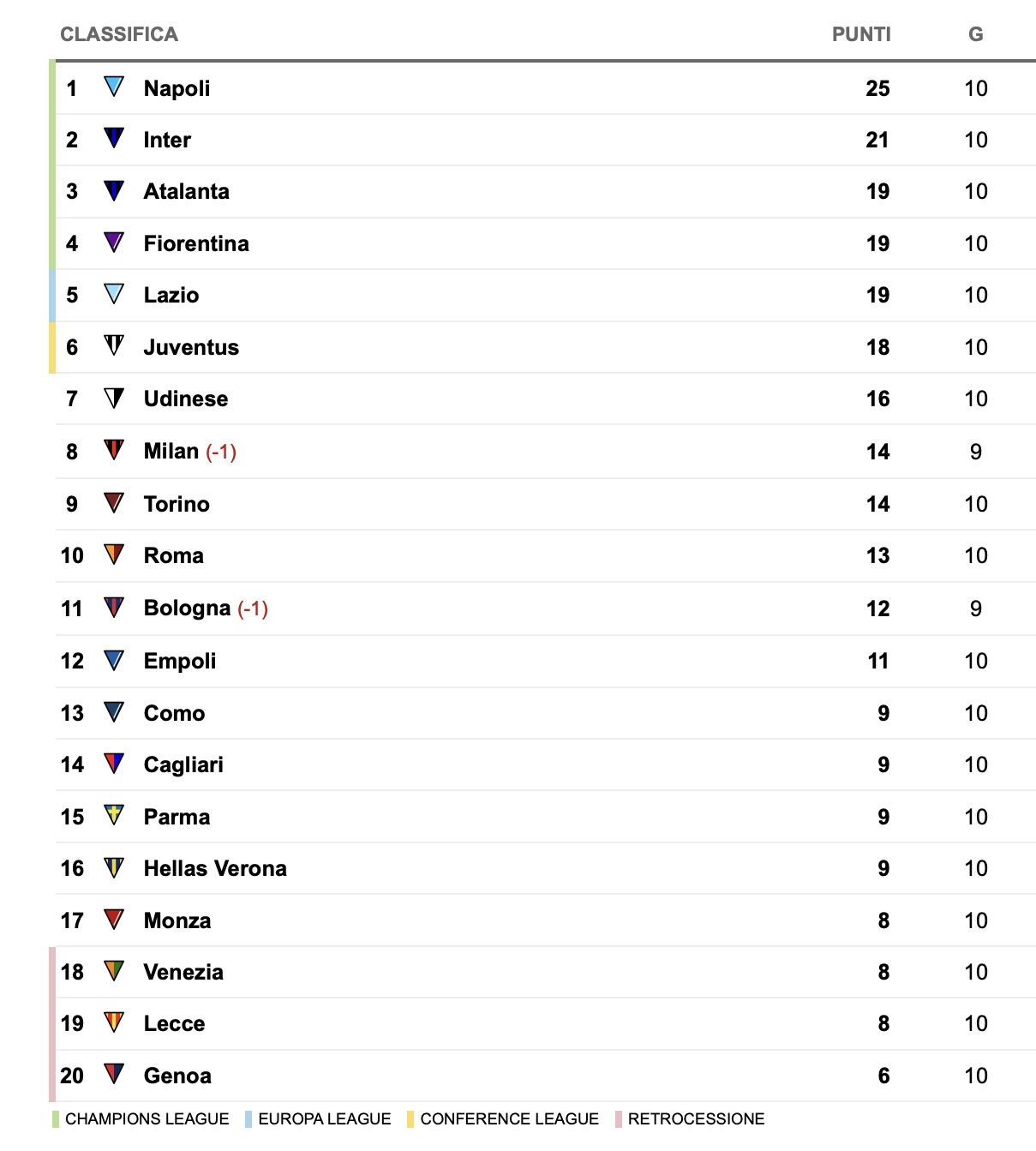Serie A, la classifica dopo la 10ª giornata: in 3 al 3° posto, Juve fuori dalla Champions!
