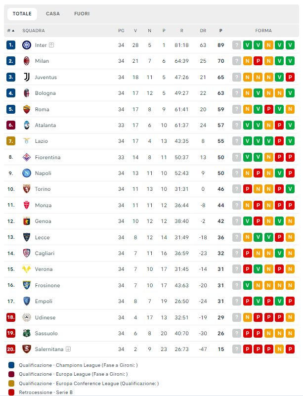 Serie A, la classifica dopo la 34ª: Napoli fuori da tutto, aggancio Viola e la Lazio scappa