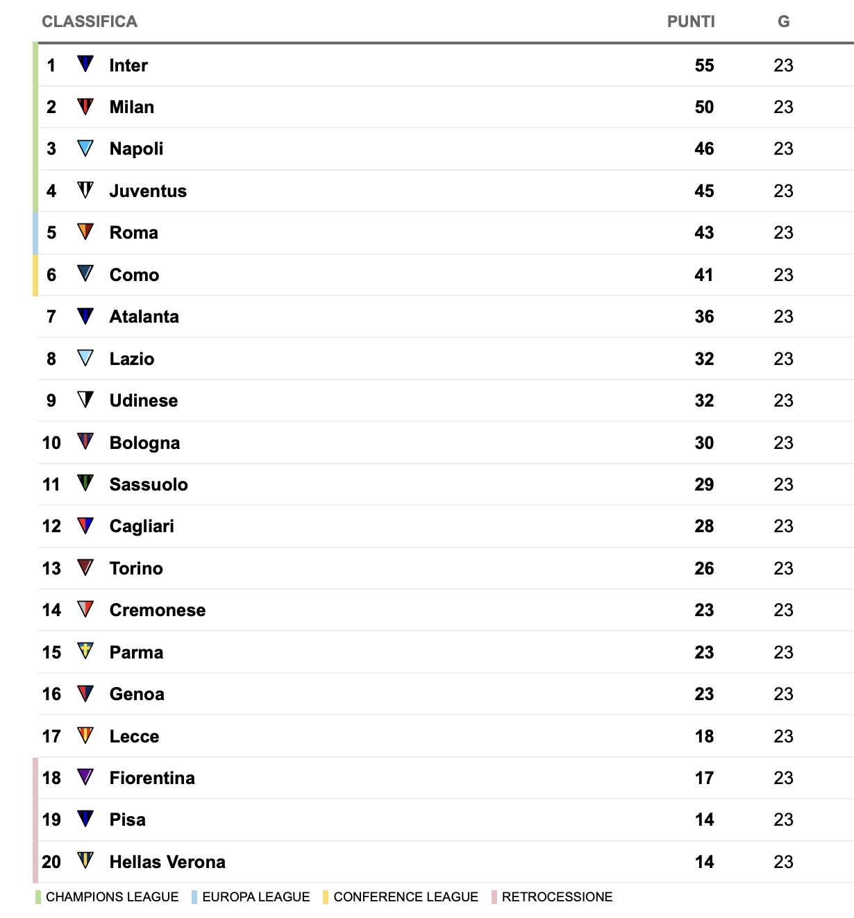 Il Milan risponde alle vittorie del week-end di Napoli e Juventus e allunga a +7 sul quinto posto, occupato ora dalla Roma. I rossoneri mantengono invariata la distanza dalla capolista Inter, sempre avanti di 5 lunghezze. Continua il momento di grande difficoltà del Bologna, ora addirittura precipitato al decimo posto e sempre più lontano dalla zona Europa. Di seguito la classifica aggiornata dopo la 23esima giornata: