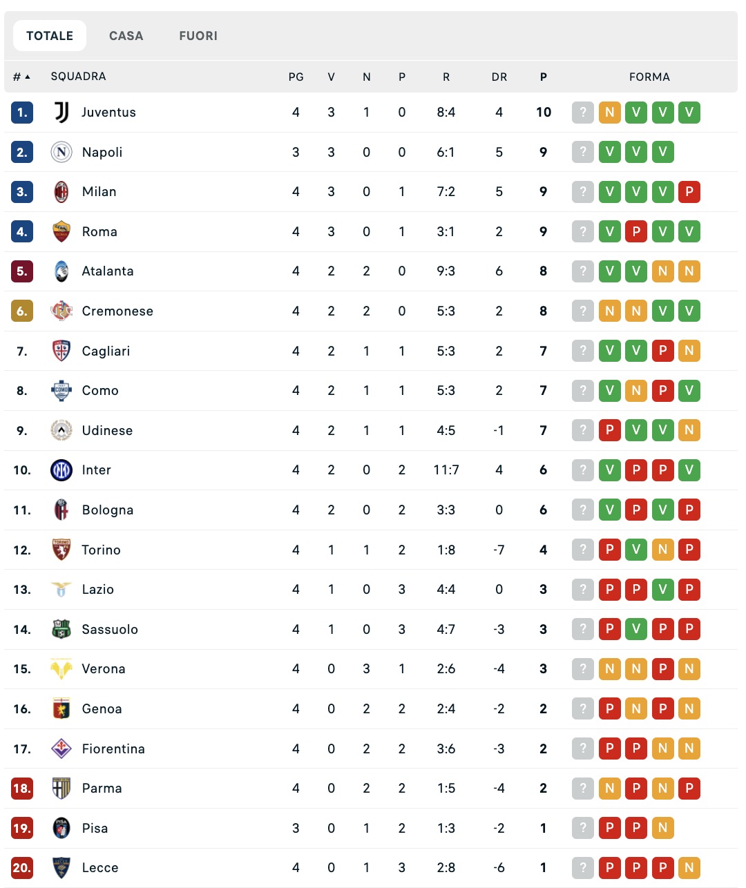 L'Inter batte 2-1 il Sassuolo e così torna a vincere, salendo a quota sei punti. Manca solo Napoli-Pisa per chiudere questa quarta giornata di Serie A: domani gli azzurri hanno la possibilità di salire da soli in vetta a punteggio pieno, in virtù del pareggio della Juventus contro il Verona. Ben piazzate a quota nove Milan e Roma, insegue anche l'Atalanta con otto punti.