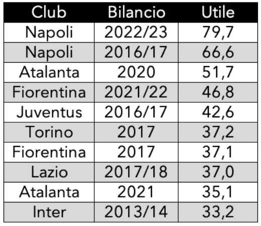 Oltre a Napoli e Atalanta, presenti anche Fiorentina, Juventus, Torino, Lazio e l’Inter. Tutti i migliori risultati sono successivi al 2013, grazie ad una maggiore attenzione alla sostenibilità nell’ultimo decennio e all'aumento dei ricavi, spinto anche dalla crescita del giro d’affari del calciomercato che ha consentito di generare maggiori plusvalenze. Tra queste quelle che hanno maggiormente inciso sono quelle ottenute: dal Napoli con la cessione di Higuain (stagione 2016/17), dalla Juventus con Pogba (2016/17), dall’Atalanta con Kulusevski (anno 2020) e dalla Fiorentina con Dusan Vlahovic e Federico Chiesa (stagione 2021/22).