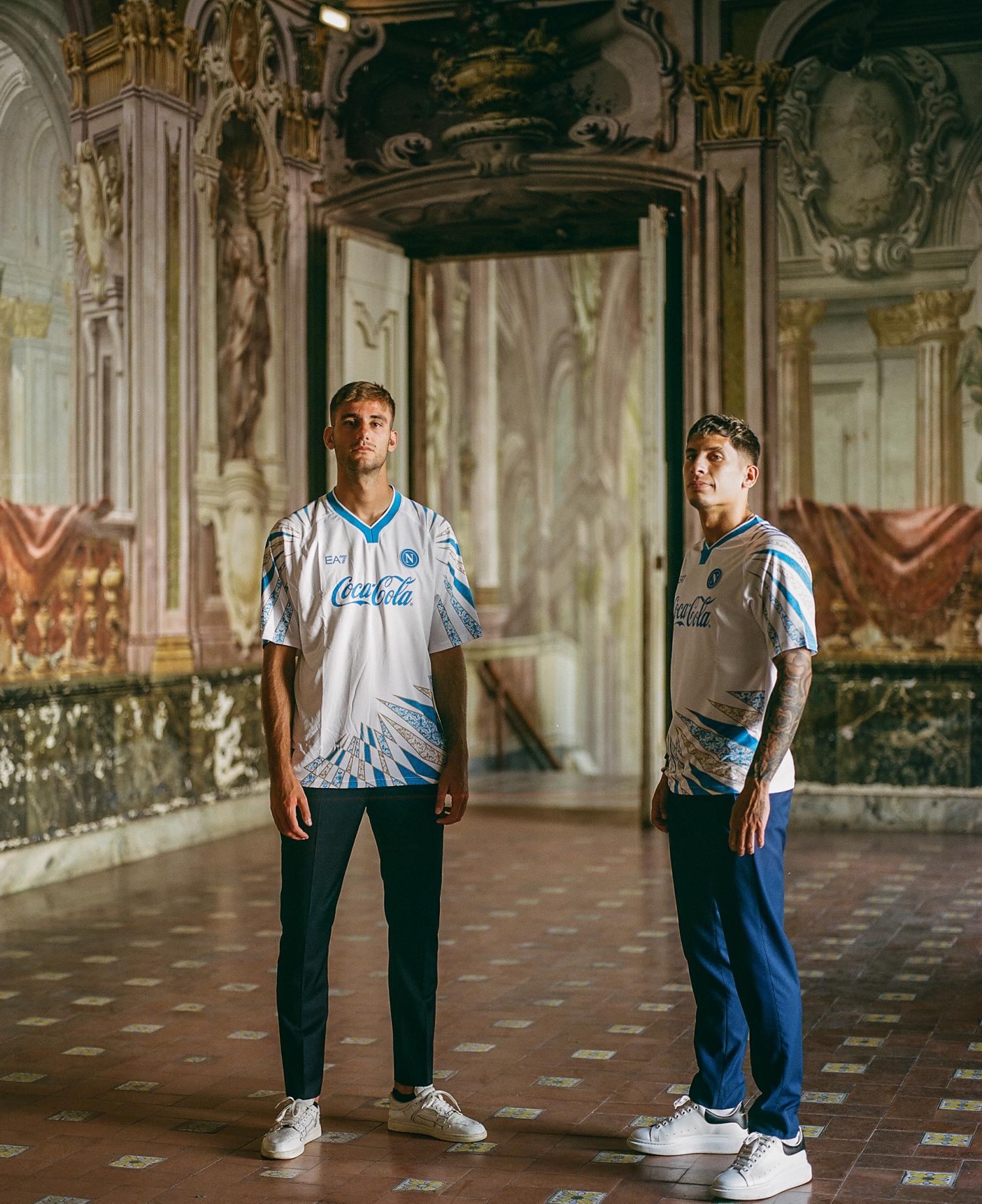 Il concept, dedicato alle Residenze Borboniche campane, fonde eleganza storica e modernità sportiva, dando vita a un connubio unico tra moda e calcio. Il bianco richiama gli elementi marmorei, fusi con il tradizionale azzurro Napoli e impreziositi da accenti dorati che evocano le decorazioni delle residenze reali. Le linee del design, fluide e contemporanee, reinterpretano in chiave sportiva la sontuosità di affreschi e mosaici.