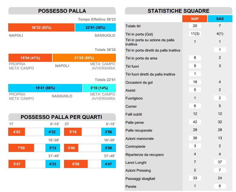 Il 3-1 non mente, nonostante qualche buona occasione concessa ai neroverdi: il Napoli col Sassuolo ha dominato. Come dimostrano le statistiche della Lega Serie A visibili in basso, i partenopei sono in vantaggio praticamente su quasi tutti i rilevamenti.
