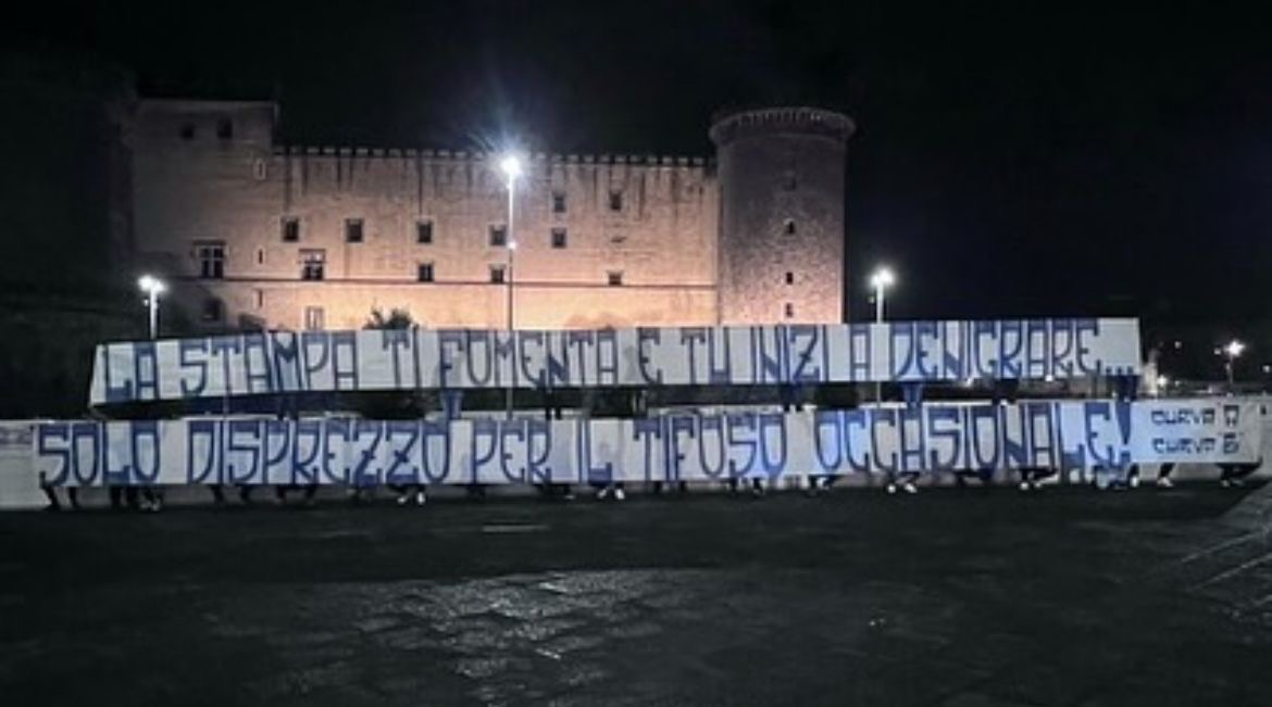 In questi minuti, dopo il lungo volantino, stanno spuntando diversi striscioni affissi in alcuni punti cardini di Napoli firmati dalla Curva A e dalla Curva B contro disfattismo e tifo occasionale.