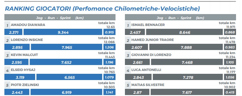 TABELLA - Contro l'Empoli nessuno corre come Diawara e Insigne: oltre 12km per i due azzurri
