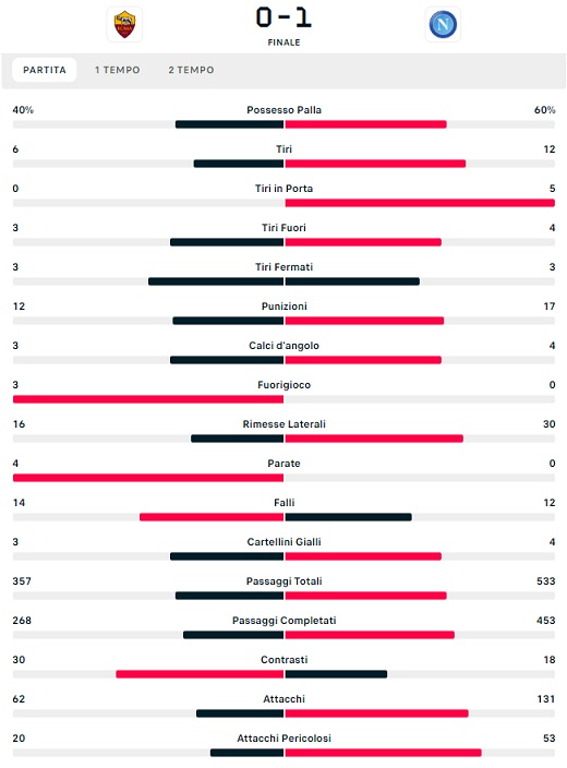 Clamoroso dato emerso in Roma-Napoli. I giallorossi non sono riusciti a fare nemmeno un tiro nello specchio della porta di Alex Meret. Attacco della Roma completamente annullato dalla retroguardia azzurra, in compenso il Napoli ha tirato in porta 5 volte.