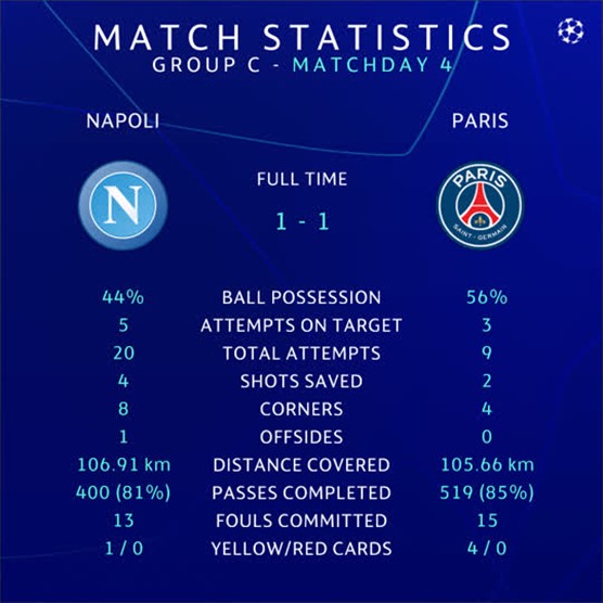 Un pareggio che ha strappato un applauso al pubblico del San Paolo ma che, dati alla mano, potrebbe anche far recriminare qualcosa al Napoli. Di fatti, gli azzurri sono arrivati per ben 20 volte al tiro (cinque in porta), rispetto alle nove conclusioni del Psg (soltanto tre nello specchio). Francesi che si sono invece imposti nel possesso palla, come dimostrano le statistiche pubblicate sul sito dell'Uefa.