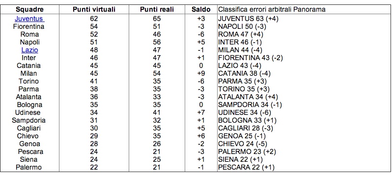 La classifica senza errori arbitrali non cambia per quanto riguarda i saldi, in prima posizione resta la Juventus seguita da Fiorentina, Roma e Napoli.