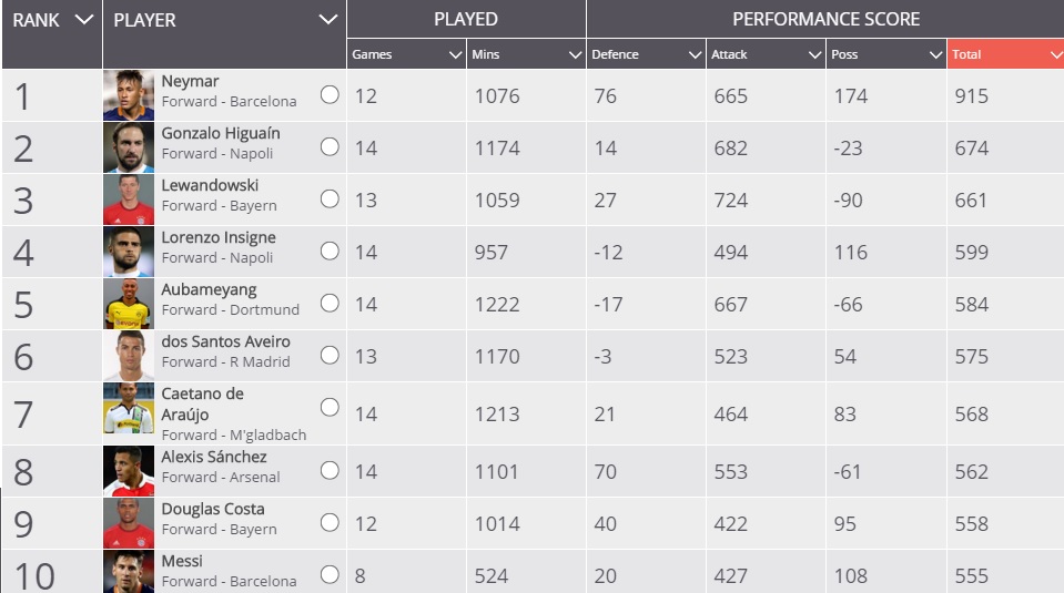 L'attacco azzurro ha trovato in Gonzalo Higuain e Lorenzo Insigne due protagonisti di rilievo internazionale: il prestigioso portale di statistiche Squawka, inserisce entrambi gli azzurri nella top-10 europea degli attaccanti per prestazioni, valutando il loro lavoro non solo dal punto di vista dei gol segnati. Davanti al Pipita c'è solo Neymar, mentre il Magnifico è quarto alle spalle di Lewandowski.