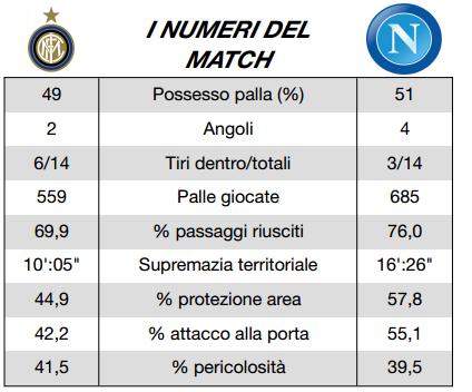 Ecco le statistiche della Lega Serie A relative al match Inter-Napoli: la supremazia degli azzurri è certificata anche dai numeri della partita.