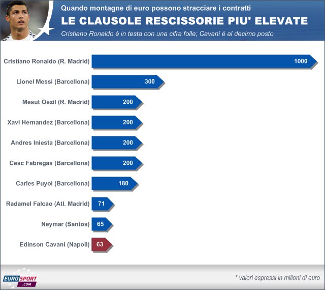 In testa a tutti, come riporta Eurosport, c'è Cristiano Ronaldo, il cui miliardo di euro fa rabbrividire soprattutto se paragonato ai "soli" 300 milioni coi quali si potrebbe stracciare il contratto di Leo Messi al Barcellona. Al terzo posto c'è un quartetto di giocatori sull'asse Real Madrid-Barcellona, composto da Mesut Oezil, Andres Iniesta, Xavi Hernandez e Cesc Fabregas, tutti liberabili con 200 milioni. In settima piazza resiste Carles Puyol, che può vantare una clausola da 180 milioni nonostante i 35 anni di età.