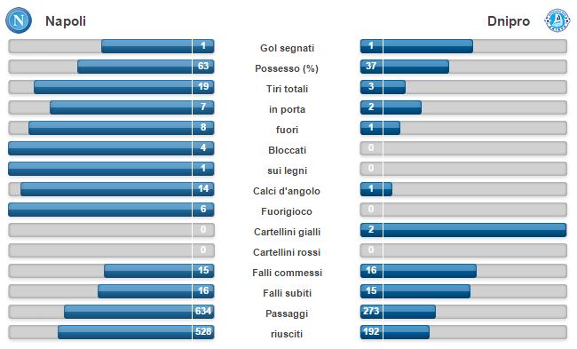 A leggere le statistiche, non c'è partita. Napoli superiore in tutto: dalle conclusioni ai calci d'angolo, passando per il possesso palla. Eppure il risultato di 1 a 1 vede favoriti gli ucraini in vista del ritorno.
