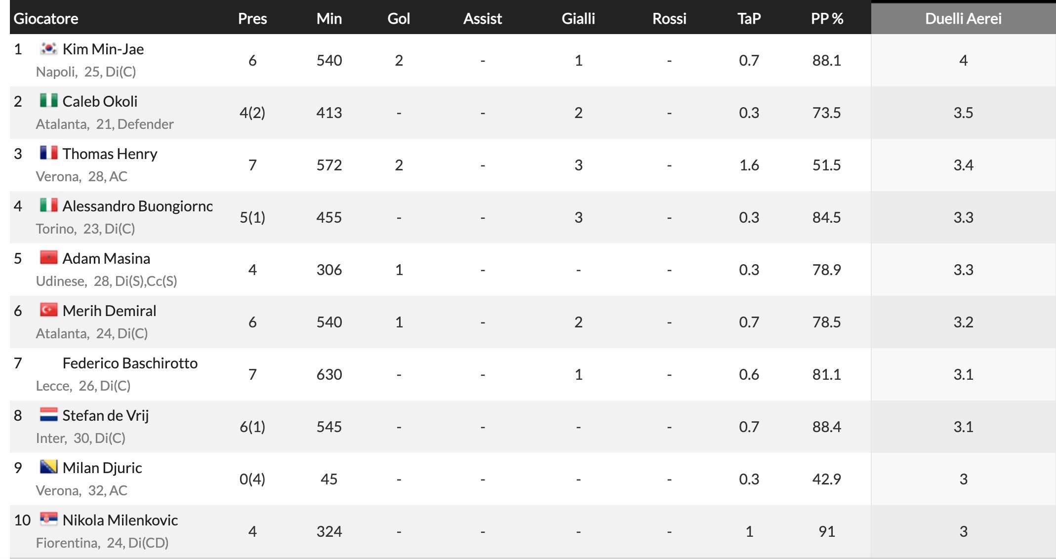 TABELLA - Mostruoso Kim: primo in Italia per duelli aerei ed il Napoli insolitamente 5°