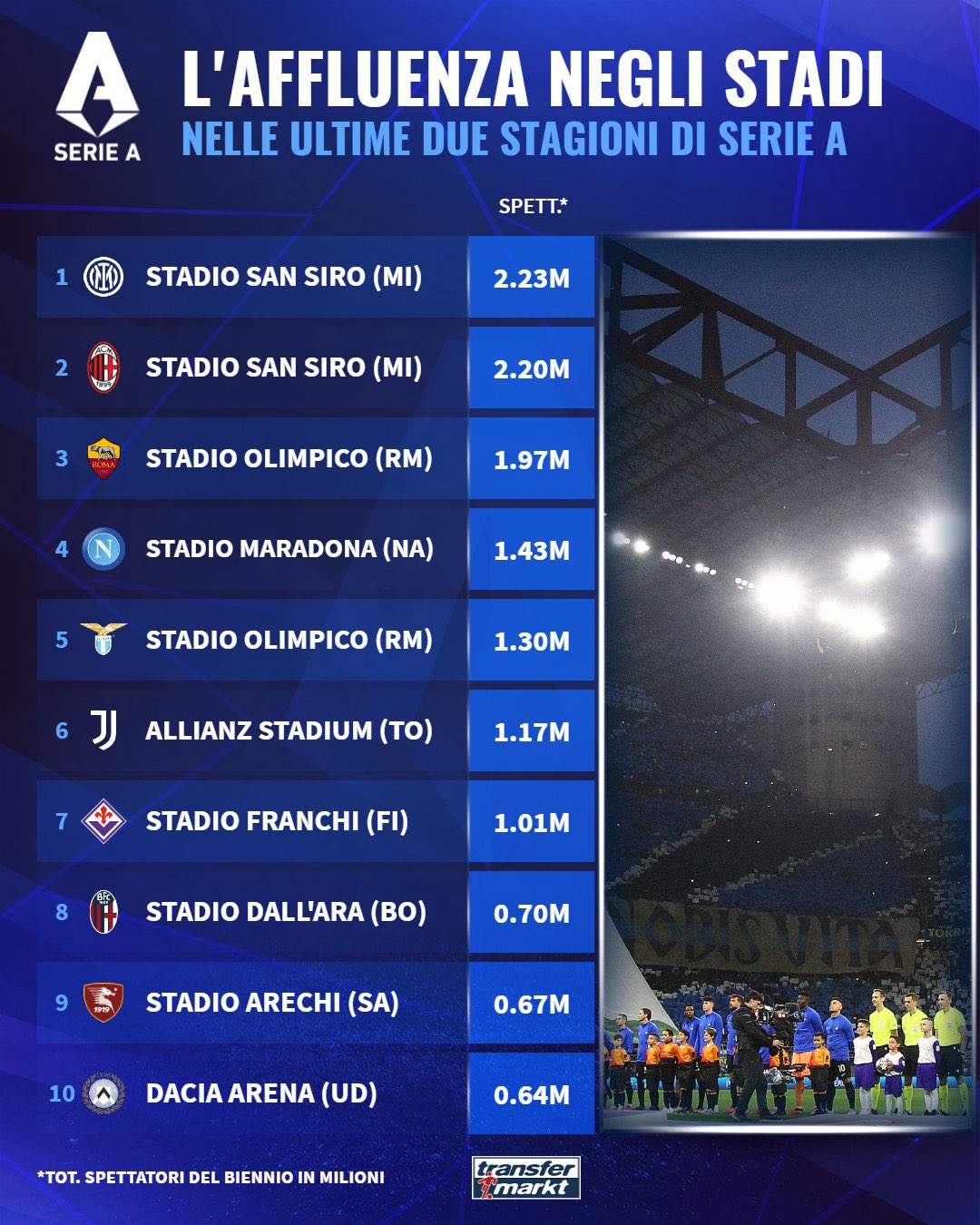 E' stata svelata da Transfertmarkt la classifica dell'affluenza negli stadi in Serie A nelle ultime due stagioni. Napoli al quarto posto con un totale di 1.43mln spettatori. Comanda la classifica l'Inter (2.23mln), seguita da Milan (2.20mln) e Roma (1.97mln), solo sesta la Juventus (1.17mln). Di seguito le prime 10 posizioni della classifica.