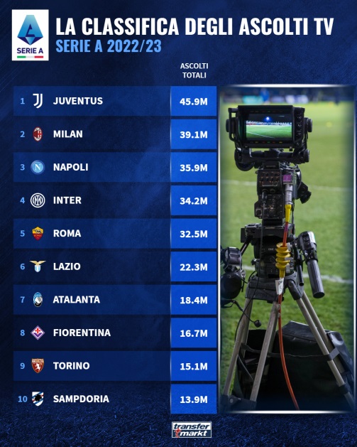 TABELLA - Serie A, la classifica degli ascolti tv nel 2022/23: Napoli terzo
