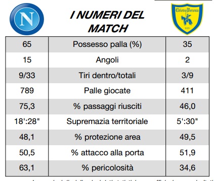 Anche le statistiche della Lega Serie A certificano lo sterile dominio del Napoli, che nonostante abbia condotto il match quasi nella sua totalità non è riuscito a portare a casa nemmeno un punto. Un attacco sterile ed impreciso è il principale colpevole della disfatta di oggi.