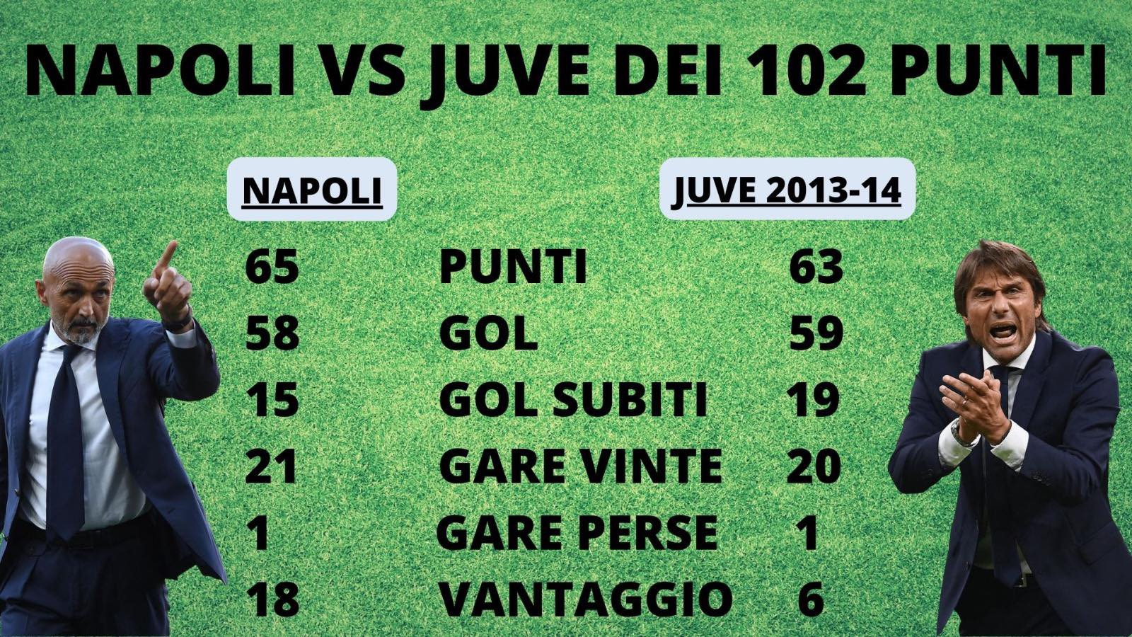 Il confronto tra il Napoli di Spalletti e la Juve di Conte: Alla 24ª giornata di campionato il Napoli è avanti di 2 punti rispetto a quella Juventus, 65 a 63. Solo un gol in meno, invece, per l'attacco azzurro, 58 a 59. Nettamente meglio la difesa di Spalletti con soli 15 gol subiti rispetto ai 19 incassati dalla Juve di Conte. Infine nel vantaggio con le inseguitrici il divario tra le due squadre è abissale, +18 del Napoli rispetto al +6 della Juventus. Di seguito la tabella riassuntiva di Tuttonapoli