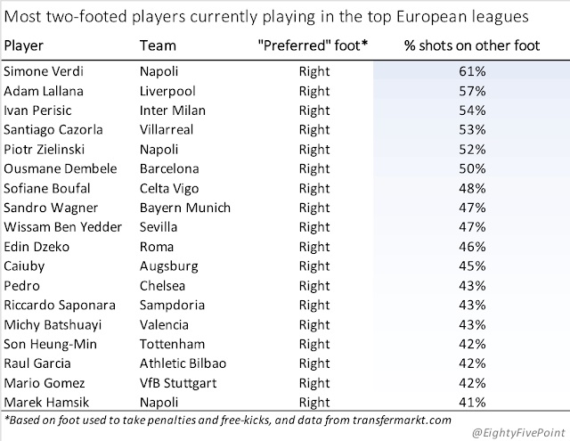 Interessante tabella pubblicata dal blog specializzato EightyFivePoints, che presenta i calciatori che, nelle cinque leghe europee più importanti, utilizzano di più il loro 'piede debole' per calciare. In Europa, nessuno come Simone Verdi, che calcia il 61% delle volte col sinistro, nonostante non sia mancino. Nella speciale classifica, presenti anche Piotr Zielinski al quinto posto, e Marek Hamsik al 18esimo. Ennesimo esempio del grande valore tecnico che vanta la rosa partenopea.