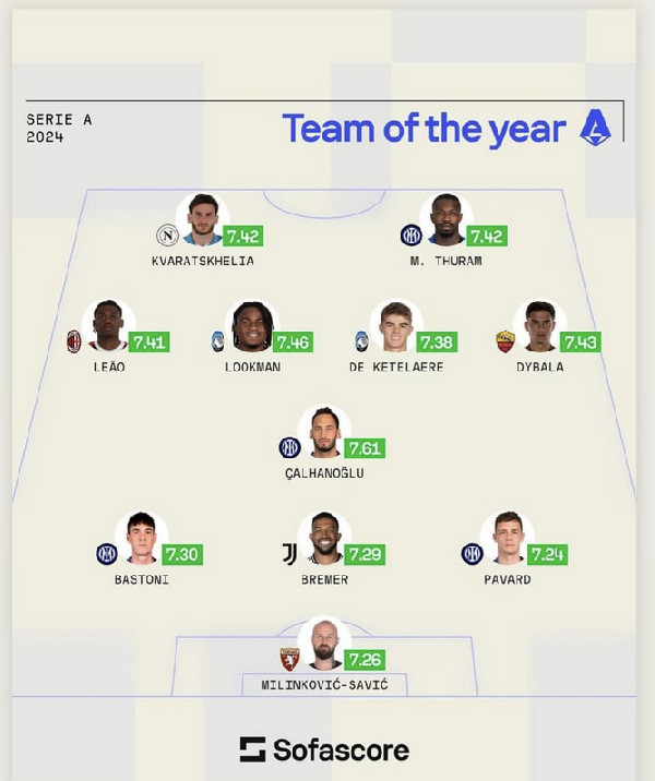 Ultime ore per l'anno 2024 ed è tempo di bilanci. Il portale Sofascore pubblica l'undici migliore per rendimento dell'ultimo anno solare. Tra i pali Milinkovic-Savic, nella difesa a tre: Pavard, Bremer e Bastoni. A centrocampo, in cabina di regia Calhanoglu. Poi un attacco stellare con Dybala, Lookman, De Ketelaere, Leao, Kvaratskhelia e Thuram.