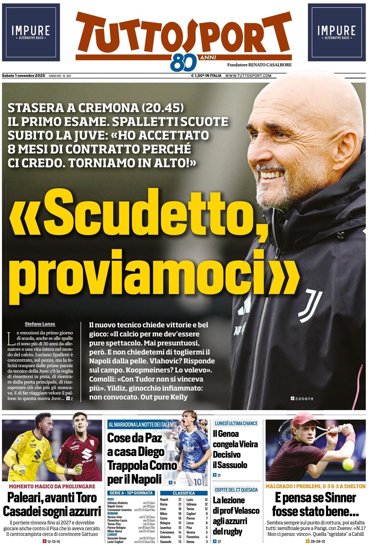 "Scudetto, proviamoci". Questo il titolo in prima pagina dell'edizione odierna di Tuttosport, Il riferimento è alle parole pronunciate in conferenza stampa da Luciano Spalletti. Il nuovo tecnico della Juventus, che ha sostituito l'esonerato Igor Tudor, ha parlato ieri in conferenza stampa introdotto da Comolli. Cose da Paz a casa Diego, il titolo in taglio basso: Trappola Como per il Napoli”, avvisa il quotidiano sportivo torinese. Di seguito la prima pagina integrale