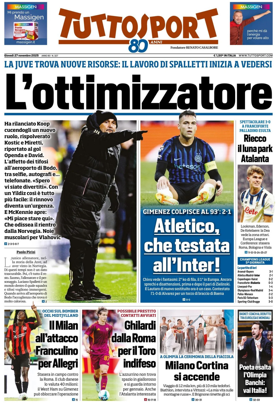 "L'ottimizzatore". Titola così in prima pagina il quotidiano Tuttosport, che si sofferma sul tecnico bianconero Luciano Spalletti. Il lavoro dell'allenatore infatti inizia a vedersi alla Juventus, visto che Spalletti ha rilanciato Koopmeiners e rispolverato Kostic e Miretti ma è anche riuscito a riportare al gol Openda e David. Tanto entusiasmo soprattutto dopo la vittoria contro il Bodo/Glimt, che ha rilanciato i bianconeri nella classifica di Champions League, dove ora la Juve è a quota 6.