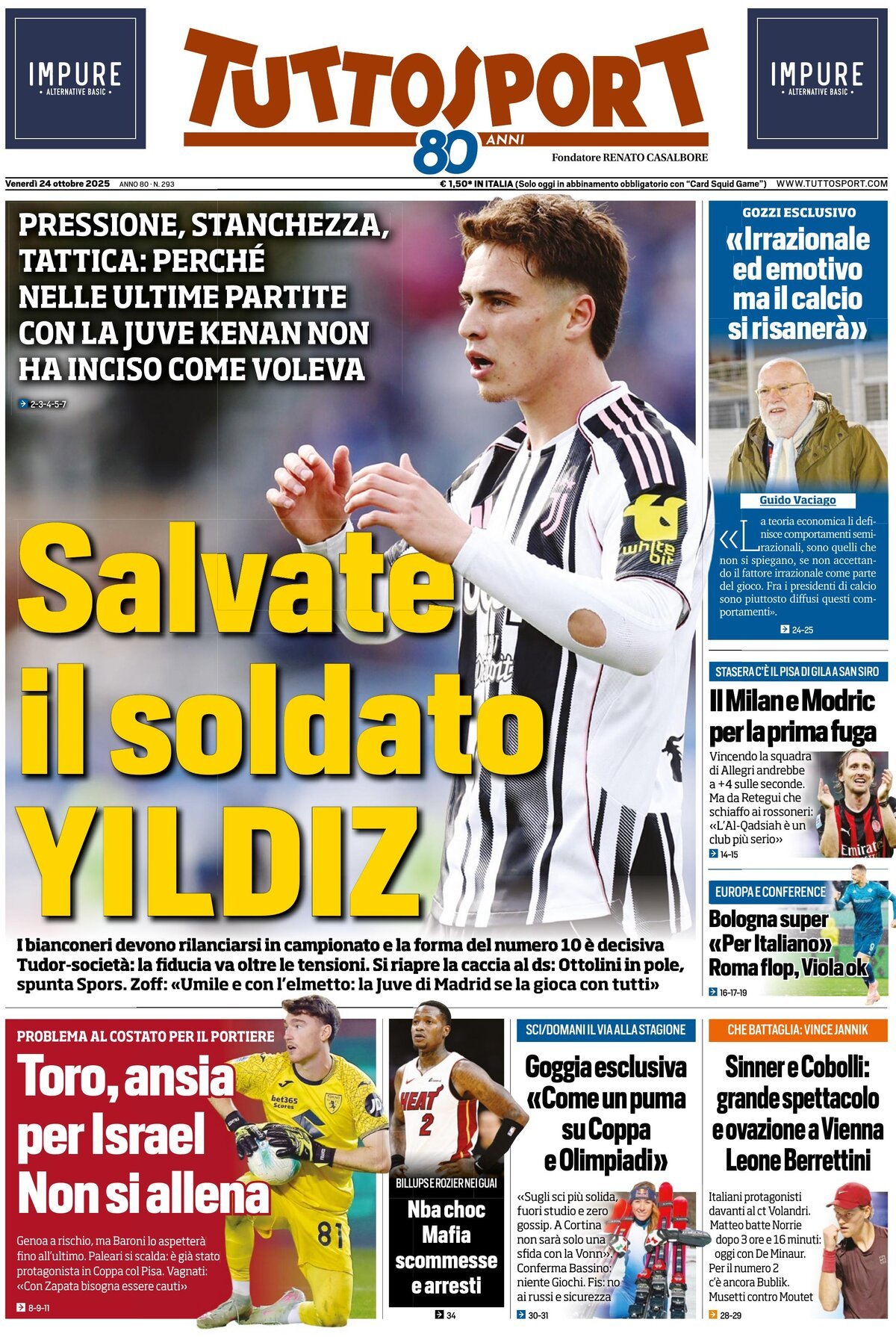 In occasione della prima pagina di oggi di Tuttosport, il titolo principale è il seguente: "Salvate il soldato Yildiz". Pressione, stanchezza e tattica: ecco perché, nelle ultime partite, Kenan non ha inciso come voleva. La Juventus deve rilanciarsi in campionato: la forma del numero 10 sarà decisiva. Tudor-società: la fiducia va oltre le tensioni.