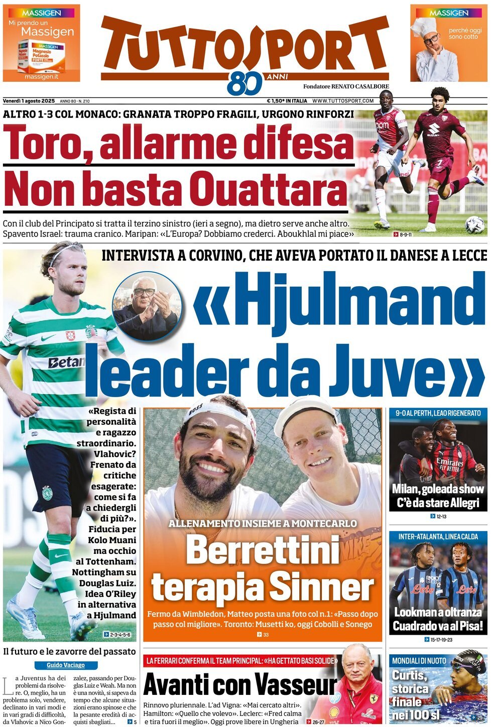 Si parla anche dell'altra metà di Torino, con questo titolo in taglio alto: "Toro, allarme difesa. Non basta Ouattara". Altro 1-3 col Monaco: granata troppo fragili, urgono rinforzi. Con il club del Principato si tratta il terzino sinistro (ieri a segno), ma dietro serve anche altro. Spavento Israel: trauma cranico. Maripan: "L'Europa? Dobbiamo crederci. Aboukhlal mi piace". Granata dunque protagonisti fin qui di un precampionato con più ombre che luci.