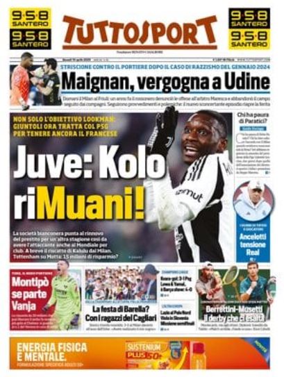 "Montipò se parte Vanjia: Milinkovic in orbita Chelsea" si legge in basso. "Juve: Kolo riMuani!" è però il titolo con cui si apre l'edizione odierna di Tuttosport in merito al mercato della Juventus e al futuro di Kolo Muani. Giuntoli sta studiando già le prossime mosse e l'obiettivo davanti resta Lookman dell'Atalanta. Ma ora tratta anche col Psg per tenere ancora l'attaccante francese.