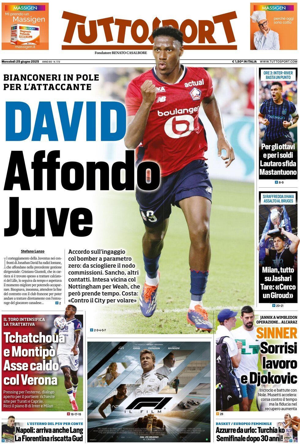 In occasione della prima pagina di oggi di Tuttosport, viene scelto questo come titolo principale: "David affondo Juve". Bianconeri in pole per l'attaccante: accordo sull'ingaggio col bomber a parametro zero, da sciogliere il nodo commissioni. Sancho, altri contatti. Intesa vicina col Nottingham per Weah, che però prende tempo. Costa: "Contro il City per volare".