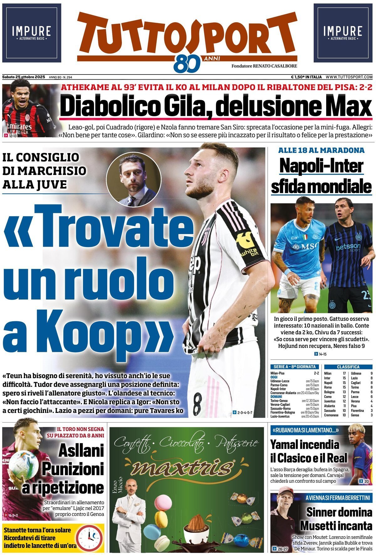 In taglio alto invece il pari del Milan: “Diabolico Gila, delusione Max” e di spalla “Napoli-Inter sfida mondiale” con in palio il primo posto mentre Gattuso osserverà 10 nazionali in ballo. Conferme su Neres falso nove per sostituire Hojlund che non ha recuperato dall'affaticamento muscolare per la sfida contro i nerazzuri.