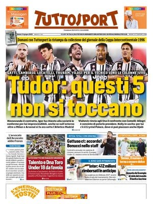 La prima pagina di Tuttosport di quest'oggi titola "5 giocatori non si toccano" in riferimento alle garanzie chieste da Igor Tudor per la prossima stagione. I nomi degli intoccabili sono: Gatti, Yildiz, Cambiaso, Locatelli e Thuram. Mentre per quanto riguarda Vlahovic, ogni discorso è rimandato negli Usa durante il Mondiale per club. C'è spazio anche per l'accordo tra Gattuso e la Nazionale con Bonucci nello staff tecnico. Mentre per l'Inter se parte Chalanoglu c'è Ederson in lista. Di seguito la prima pagina integrale