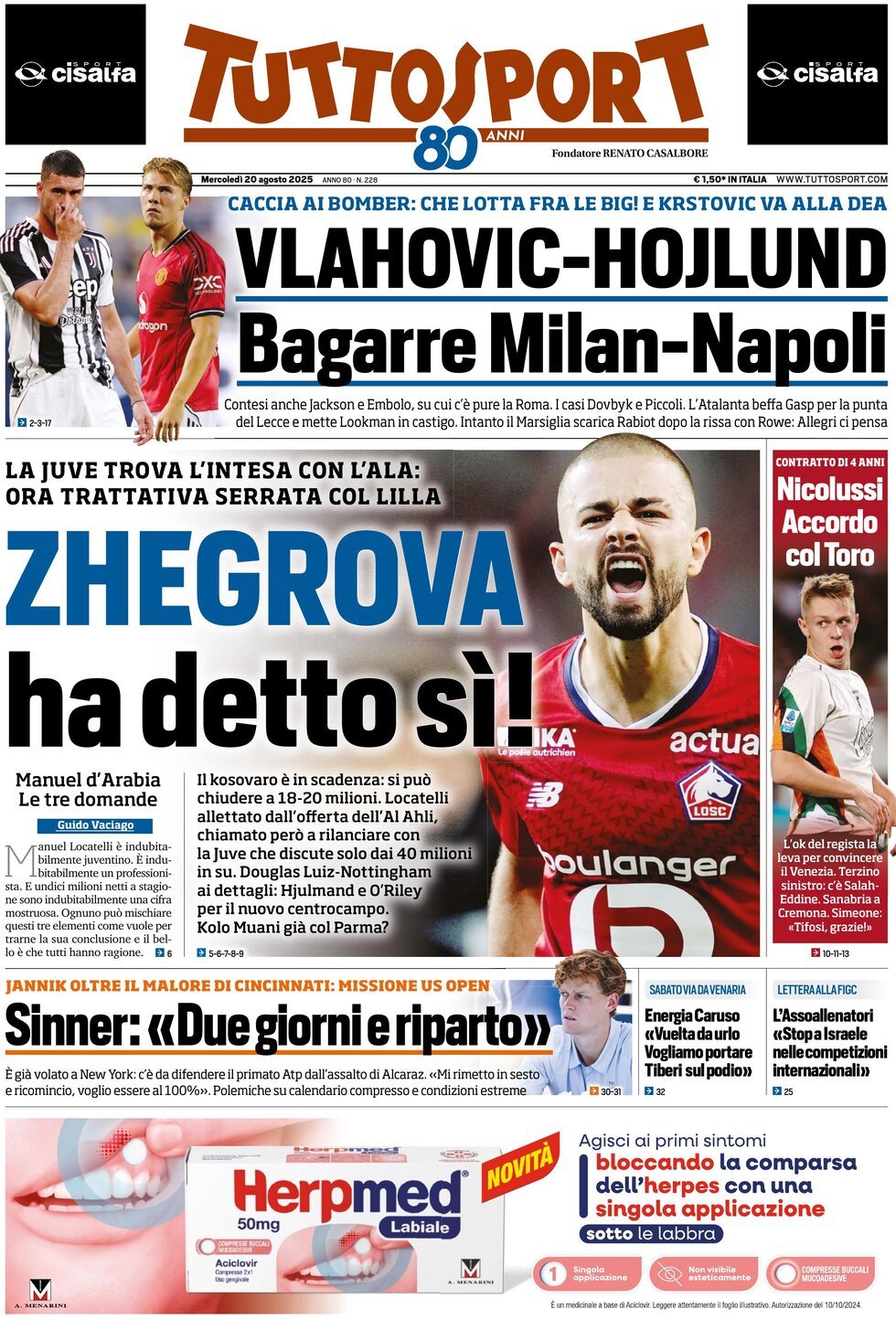 In occasione della prima pagina di oggi: Tuttosport ha scelto questo come titolo principale: "Zhegrova ha detto sì!". La Juve trova l'intesa con l'ala: ora trattativa serrata con il Lille. Il kosovaro è in scadenza: si può chiudere a 18-20 milioni. Locatelli allettato dall'offerta dell'Al Ahli, chiamato però a rilanciare con la Juve che discute solo dai 40 milioni in su. Douglas Luiz-Nottingham ai dettagli: Hjulmand e O'Riley per il nuovo centrocampo. Kolo Muani già col Parma?