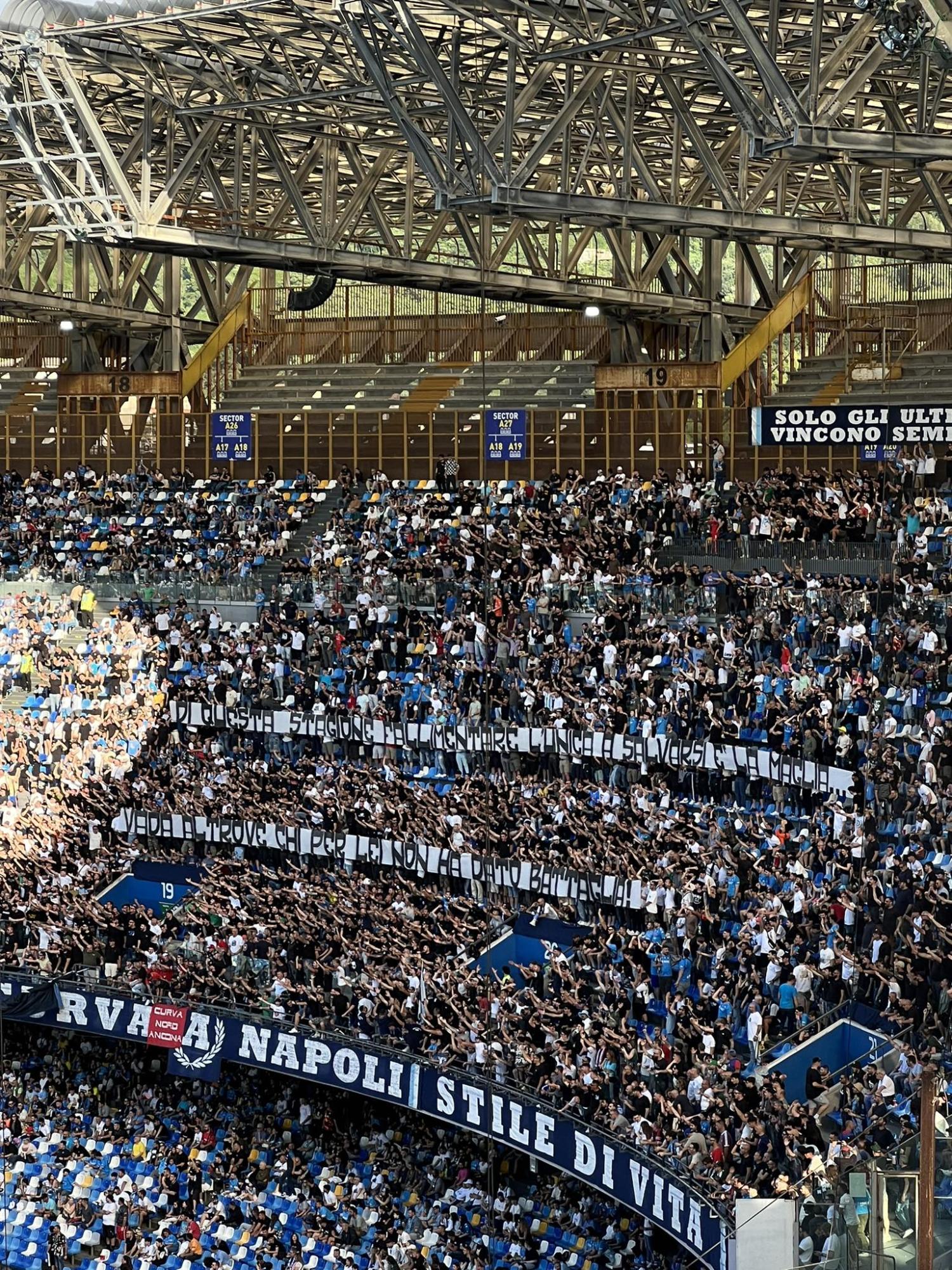 Al 15' di Napoli-Lecce i tifosi della Curva A espongono uno striscione e fanno partire dei cori di contestazione nel silenzio del Maradona: "Solo la maglia!", "ADL Meritiamo di più!", "Via da Napoli!", "Mercenari senza palle siete voi!".