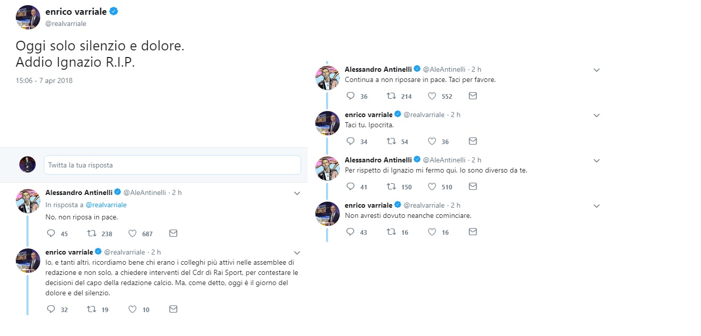 Pesante scambio di tweet tra i giornalisti Rai Enrico Varriale e Alessandro Antinelli. Al messaggio di condoglianze per la morte di Ignazio Scardina del primo, il secondo ha risposto in maniera piccata, scatenando una vera e propria discussione pubblica tra i colleghi. A scatenare l’astio, a quanto pare, i contrasti che ebbe Varriale con Scardina ai tempi dello scandalo Calciopoli, quando il giornalista deceduto oggi fu accusato di aver privilegiato alcune figure nella redazione per favorire, con servizi compiacenti, la Juve targata Moggi. Il giornalista, coinvolto nel processo Calciopoli, fu assolto nel 2011, ma la vicenda lo sconvolse profondamente.