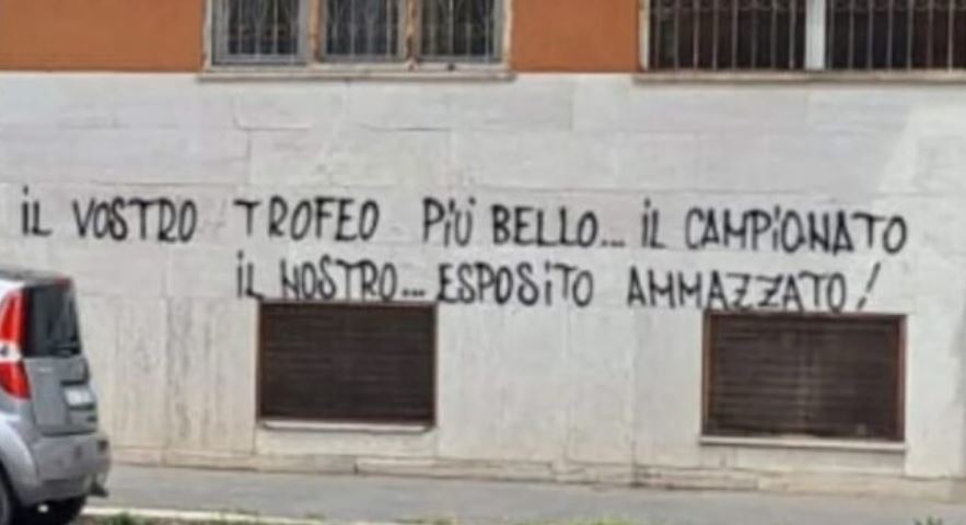 "Il vostro trofeo più bello...il campionato. Il nostro...Esposito ammazzato": è questa la scritta vergognosa apparsa nelle scorse ore sulle mura della città di Roma dopo la vittoria del tricolore del Napoli. Offesa ancora una volta la memoria e il ricordo di Ciro Esposito, tifoso del Napoli ucciso nel 2014 prima della finale dell'Olimpico di Coppa Italia tra Napoli e Fiorentina.