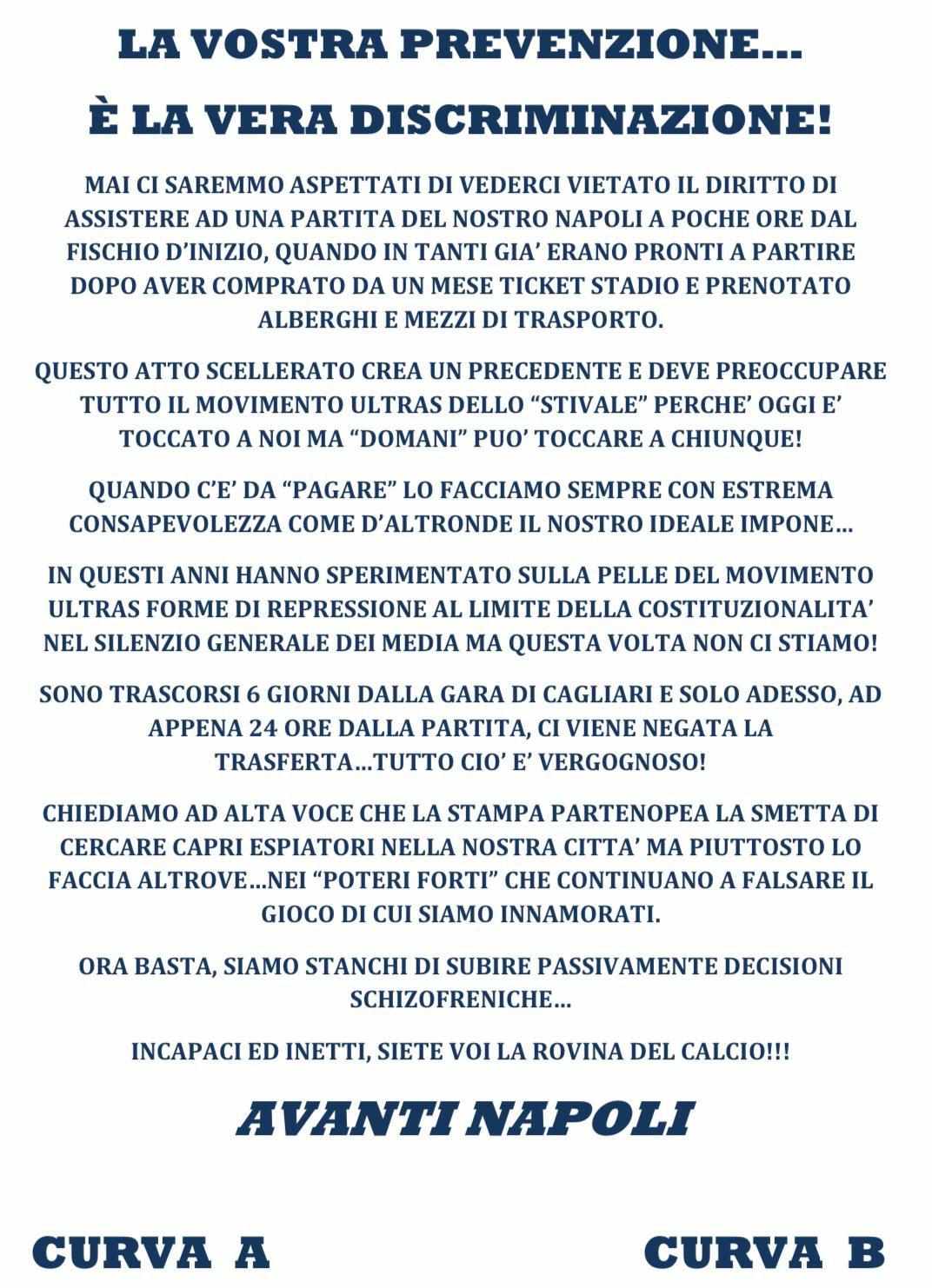 Quando c'è da pagare lo facciamo sempre con consapevolezza come il nostro ideale impone, ma in questi anni hanno sperimentato sulla nostra pelle forme di repressione al limite della costituzionalità nel silenzio dei media, ma questa volta non ci stiamo. Dopo 6 giorni da Cagliari, a 24h dalla gara ci viene vietata la trasferta: è vergognoso. Chiediamo che la stampa partenopea la smetta di cercare capri espiatori nella nostra città, ma piuttosto lo faccia altrove, nei poteri forti che continuano a falsare il gioco di cui siamo innamorati. Ora basta, siamo stanchi di subire passivamente decisioni schizofreniche. Incapaci ed inetti, siete voi la rovina del calcio. Avanti Napoli". recita il volantino diventato già virale sui social.