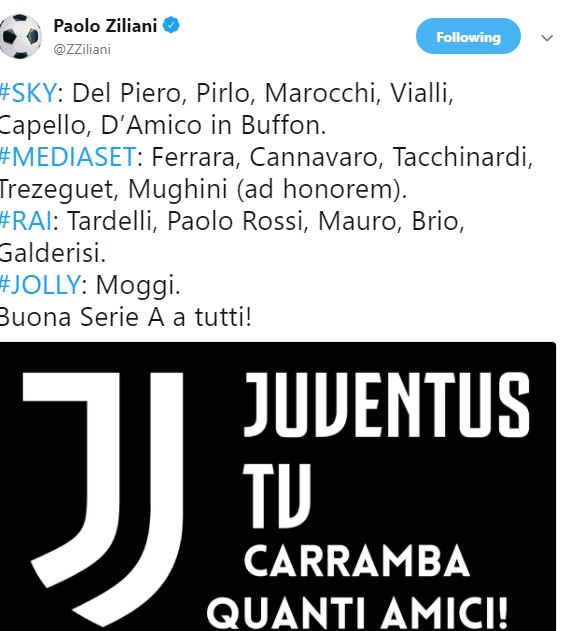 Paolo Ziliani, giornalista 'epurato' da Mediaset per mano della Juventus secondo quanto svelato ieri da La Verità, ha pubblicato su Twitter un elenco con i vari opinionisti schierati nelle tv sportive e non solo, la cui maggioranza è dichiaratamente juventina.