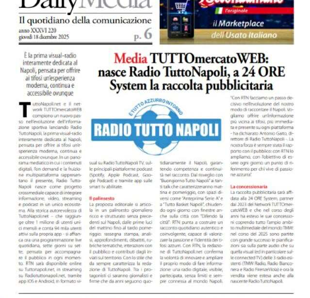 TuttoNapoli.net e il network TUTTOmercatoWEB compiono un nuovo passo nell’evoluzione dell’informazione sportiva con Radio TuttoNapoli, la prima visual-radio interamente dedicata al Napoli, pensata per offrire ai tifosi un’esperienza moderna, continua e accessibile ovunque. In un panorama mediatico in cui i contenuti digitali, l’on demand e la fruizione multipiattaforma rappresentano il presente, Radio TuttoNapoli si propone come progetto crossmediale capace di integrare informazione, video, streaming e podcast in un unico ecosistema.