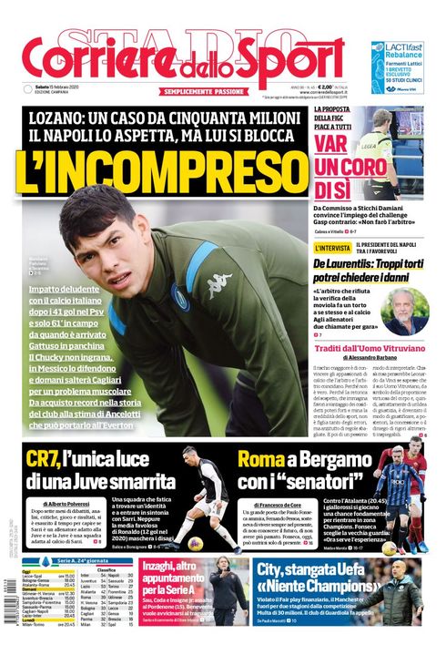 Il Corriere dello Sport, nelle pagine interne dell'edizione oggi in edicola, analizza il rendimento di uno dei giocatori più attesi a Napoli a inizio stagione: "Lozano, un caso da cinquanta milioni e un decollo che non è mai avvenuto. È l'acquisto più costoso della storia del club azzurro. Con Gattuso in campo solo 61 minuti. Per il messicano stop in allenamento, lieve contrattura all'adduttore destro", la lunga titolazione sui partenopei.