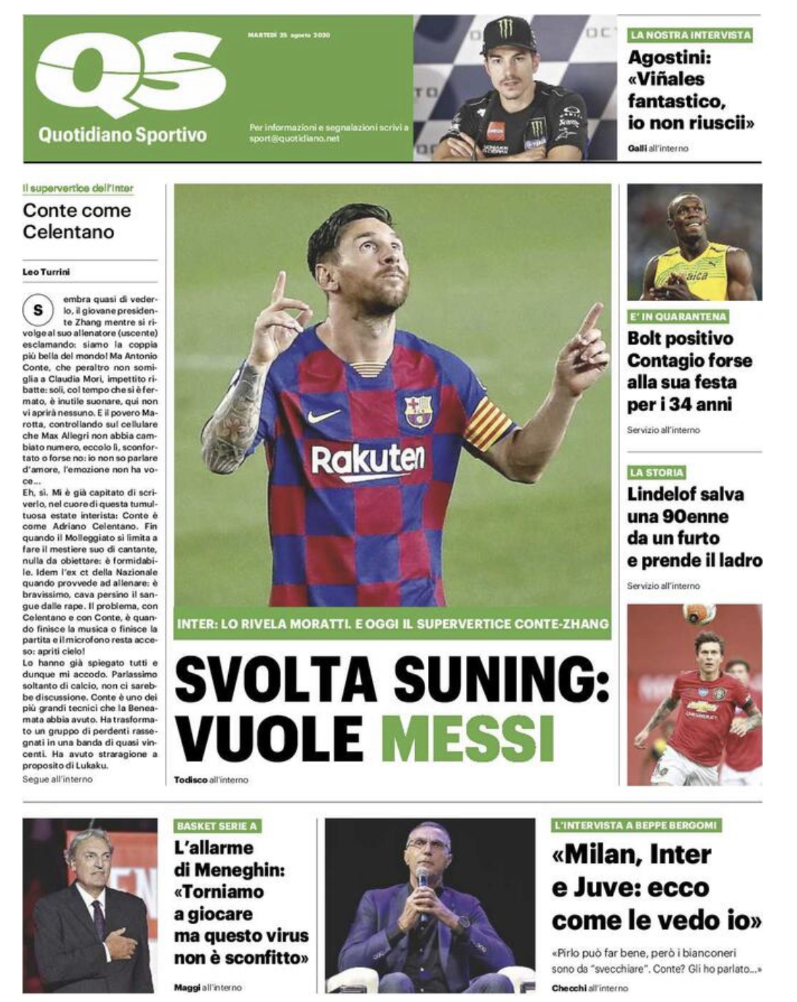 "Svolta Suning: vuole Messi". Si apre così l'edizione odierna del QS in riferimento al possibile colpo di mercato dell'Inter che porta il nome di Leo Messi. Lo ha rivelato Moratti e oggi andrà in scena il supervertice Conte-Zhang. La proprietà esclude l’esonero e buonuscite onerose: oggi la decisione. Intanto Moratti infiamma i tifosi: «Suning vuole Messi». . Nelle prossime ore il presidente nerazzurro vedrà Antonio Conte in un faccia a faccia che non dovrebbe prevedere la presenza di altri componenti".