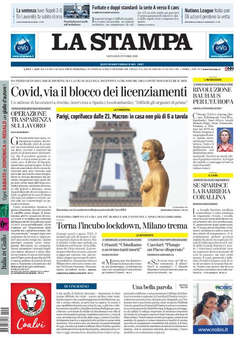La Stampa in edicola questa mattina utilizza il titolo seguente nel taglio alto della prima pagina: "Juve-Napoli 3-0. De Laurentiis fa subito ricorso". Il Giudice - si legge all'interno a pagina 28 - decreta la vittoria dei bianconeri a tavolino e il -1 in classifica agli azzurri. Pronto il ricorso da parte del club partenopeo: "La decisione di non giocare ha anticipato lo stop della Asl".